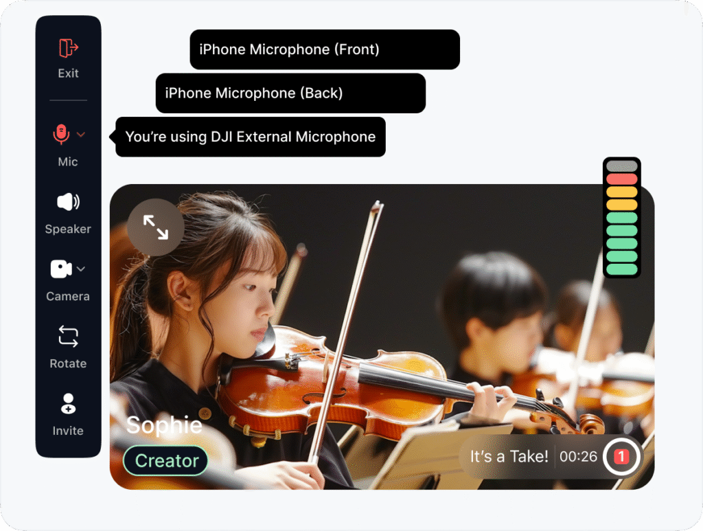 When you host or join a session, TakeStage records each participant separately using their deviceโs camera and microphone. After the session ends, each track is automatically synced, allowing for clean mixing, editing, and review.
