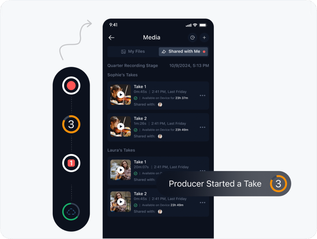 Recorded Takes are organized locally on device and automatically uploaded to the TakeStage cloud library. Creator recordings are seamlessly shared with other participants from the session.