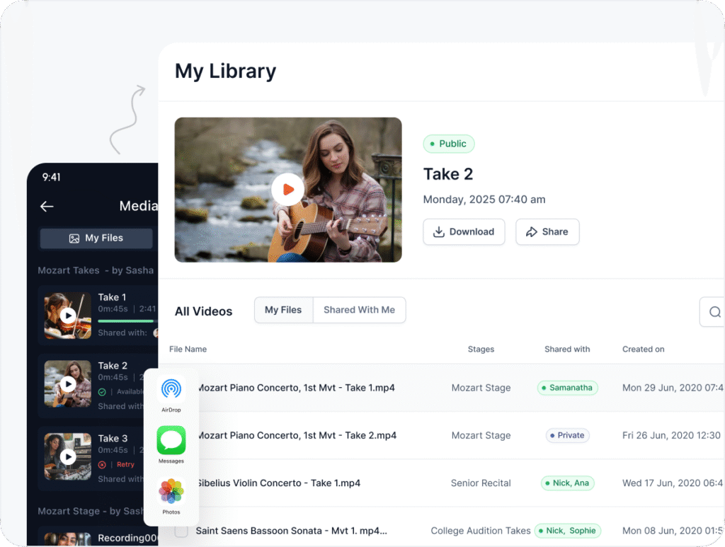 Every session saves automatically to your TakeStage account. Share directly with colleges, festival committees, or collaborators. No file compression, no quality loss. Just professional recordings that represent your true sound.