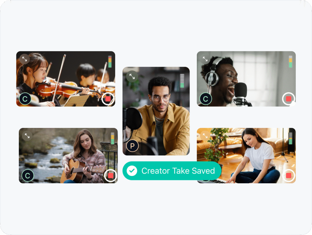 Yes! TakeStage supports real-time sessions where you can perform, teach, or collaborate with others while recording. Each participantโs feed is captured in sync, so you can focus on the music rather than the tech.